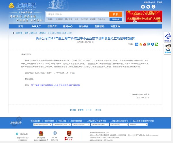 6月5日,上海市科學(xué)技術(shù)委員會(huì)發(fā)布關(guān)于2017年度上海市科技型中小企業(yè)技術(shù)創(chuàng)新資金擬立項(xiàng)名單的通知。熱烈祝賀包括上海星谷信息科技有限公司、尚科生物醫(yī)藥(上海)有限公司、上海云梯信息科技有限公司等在內(nèi)的優(yōu)秀企業(yè),獲得本次創(chuàng)新資金支持。